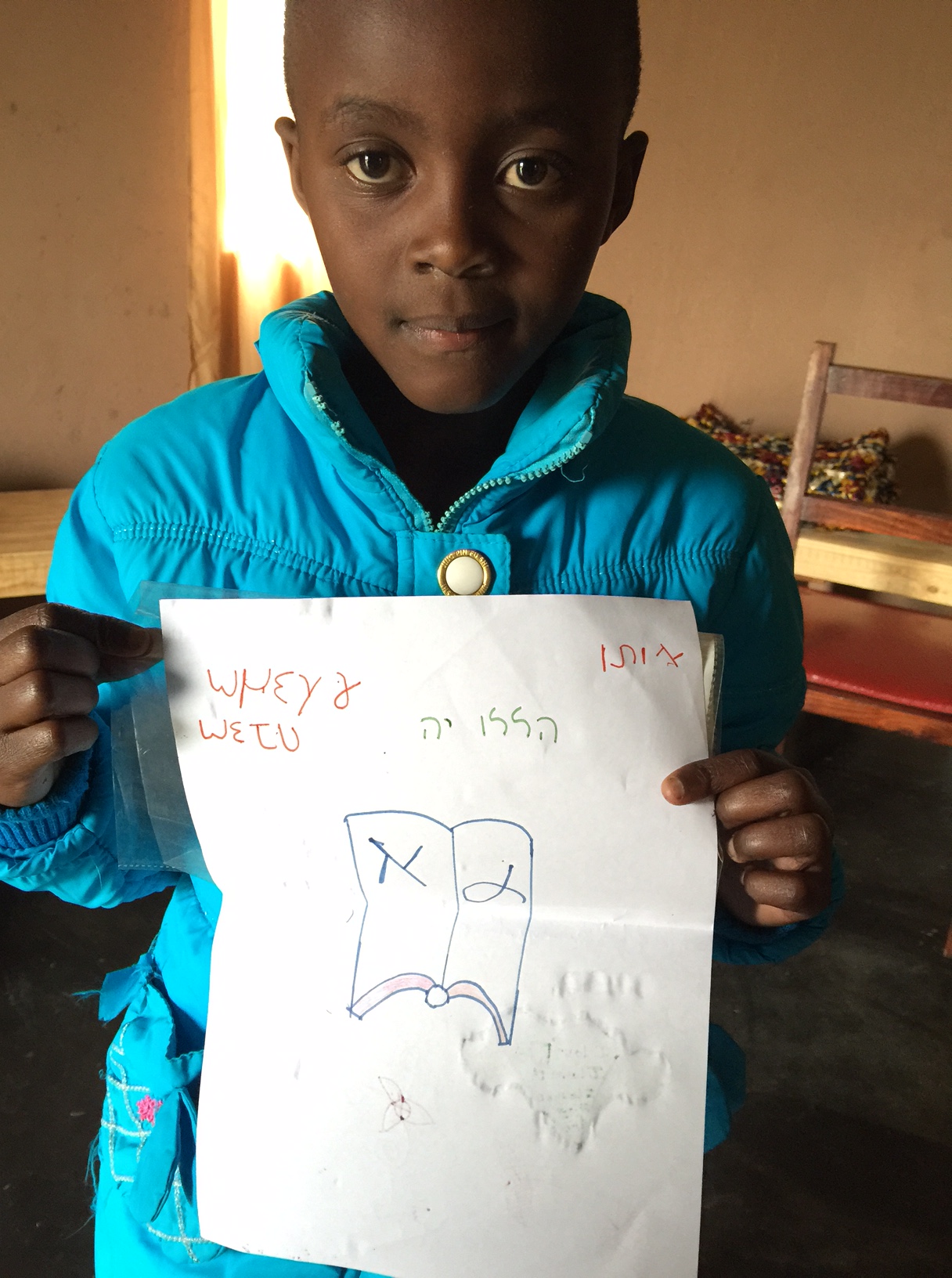 The Kids drew a picture of the Bible with their names in Hebrew and Greek letters to learn that the Bible was not written in Zulu or English. Here is Thabi with her picture.